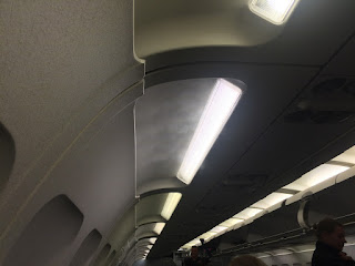 今日は大陸を東から西への移動。マイアミからポートランドはほぼアメリカを対角線に渡ることになるので長旅となる。朝の3時過ぎに起きて4時にはホテルを出発。5時過ぎの空港でのチェックインに向けての移動。チェックインが6時前に始まるのだが、セキュリティチェックが開いたのが5時半。その後は特段問題なく搭乗ゲートですこしまって機内へ。機内で驚いたのは、日本の真夏にバスに乗った時のようにエアコンの吹き出し口から写真のような結露した空気が吹き出していた。この懐かしくもある蒸し暑い空気ともこれでしばらくはおわかれ。